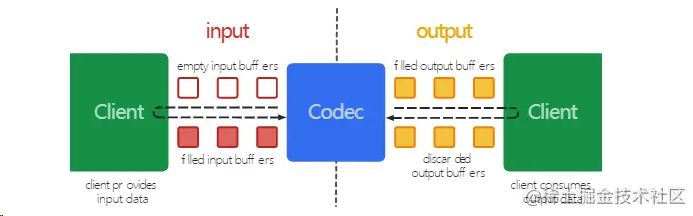 MediaCodec 首先获取一个空的输入缓冲区,填充要编码或解码的数据,再将填充数据的输入缓冲区送到 MediaCodec 进行处理,处理完数据后会释放这个填充数据的输入缓冲区,最后获取已经编码或解码的输出缓冲区,使用完毕后释放输出缓冲区,其编解码的流程示意图如下: