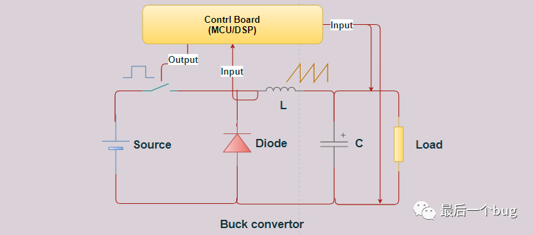 比如下面buck变换器示意图,通过使用控制芯片AD采集电流电压,经过一系列滤波控制输出合适的占空比控制开关管来给负载供能。