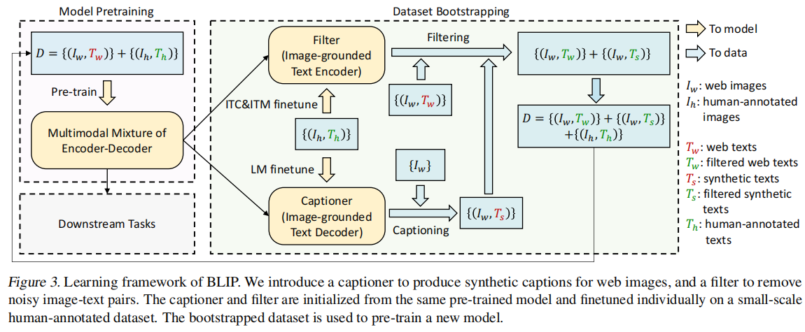 具体地,字幕器是一个以图像为基础的文本解码器,可以利用LM目标来解码给定图像的文本。给定网站图像Iw,字幕器生成合成字幕Ts,每张图像有一个字幕。过滤器是一个以图像为基础的文本编码器,通过ITC和ITM目标来确定文本是否与图像匹配。过滤器移除原始网站文本Tw和合成文本Ts中的噪声文本,如果ITM头部预测文本与图像不匹配,则认为文本是有噪声的。最后,将过滤后的图像-文本对与人类注释对相结合,形成一个新的数据集,我们用它来预训练一个新的模型。