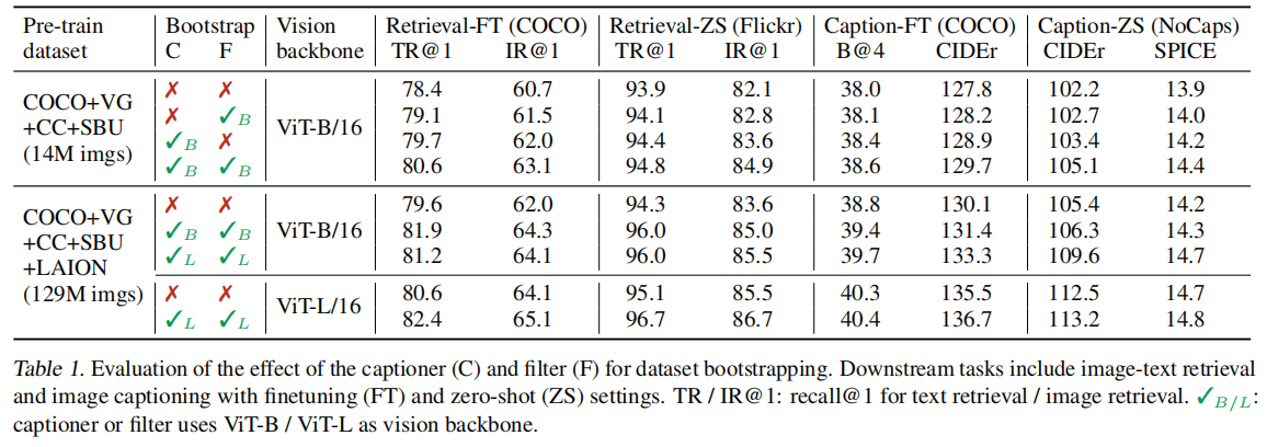 表1中,比较了不同数据集上预训练的模型,以证明CapFilt在下游任务上的有效性,包括图像-文本检索和微调的图像标注和零样本设置。