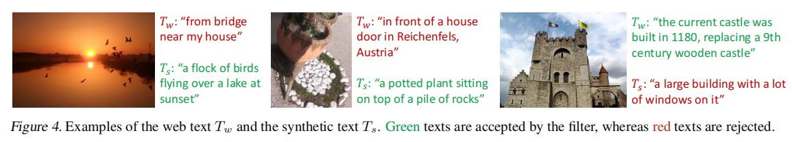 图4展示了一些示例字幕和相应的图像,定性的展示了字幕器生成新的文本描述的效果,过滤器从原始网站文本和合成文本中移除有噪声的字幕。
