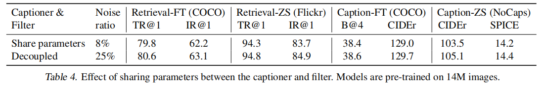 在CapFilt期间,字幕器和过滤器将在COCO上分别进行端到端微调。表4中,我们研究了字幕器和过滤器是否以与预训练相同的方式共享参数的效果。对下游任务的表现下降,我们主要将其归因于确认偏差,由于参数共享,由字幕器产生的噪声字幕不太可能被滤波器过滤掉,这从较低的噪声比中可以看出。