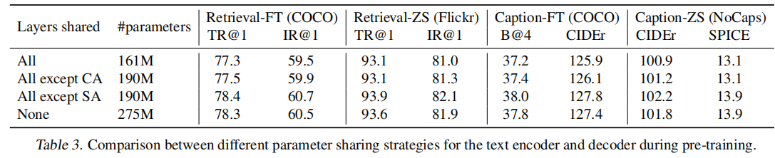 为使预训练任务更高效,文本编码器和文本解码器共享除SA层的所有参数,原因是编码和解码任务间的差异最好由SA层捕获。特别地,编码器利用双向自注意力来构建当前输入标记,而解码器使用因果自注意力来预测下一个标记。另一方面,嵌入层、CA层和FFN在编码和解码任务之间的功能相似,因此共享这些层可以在享受多任务学习的同时提高训练效率。
