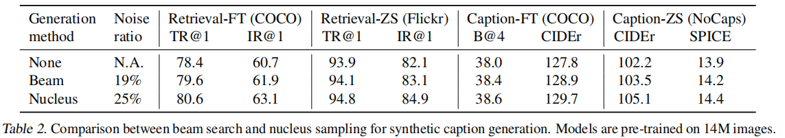 在CapFilt中,我们利用核采样来生成合成标题。 核采样是一种随机解码方法,每个标记是从一组累积概率质量超过阈值p(实验中p=0.9)的标记中采样。表2中,将其与波束搜索进行比较,这是一种确定性解码方法,旨在生成概率最高的标题。核采样有更好的性能,尽管是更大的噪声。我们假设,原因是核采样产生了更对多样化和令人惊讶的字幕,其中包含了更多样化的新信息,模型可以从中受益。另一方面,波束搜索倾向于生成数据集中常见的安全字幕,因此提供更少的额外知识。