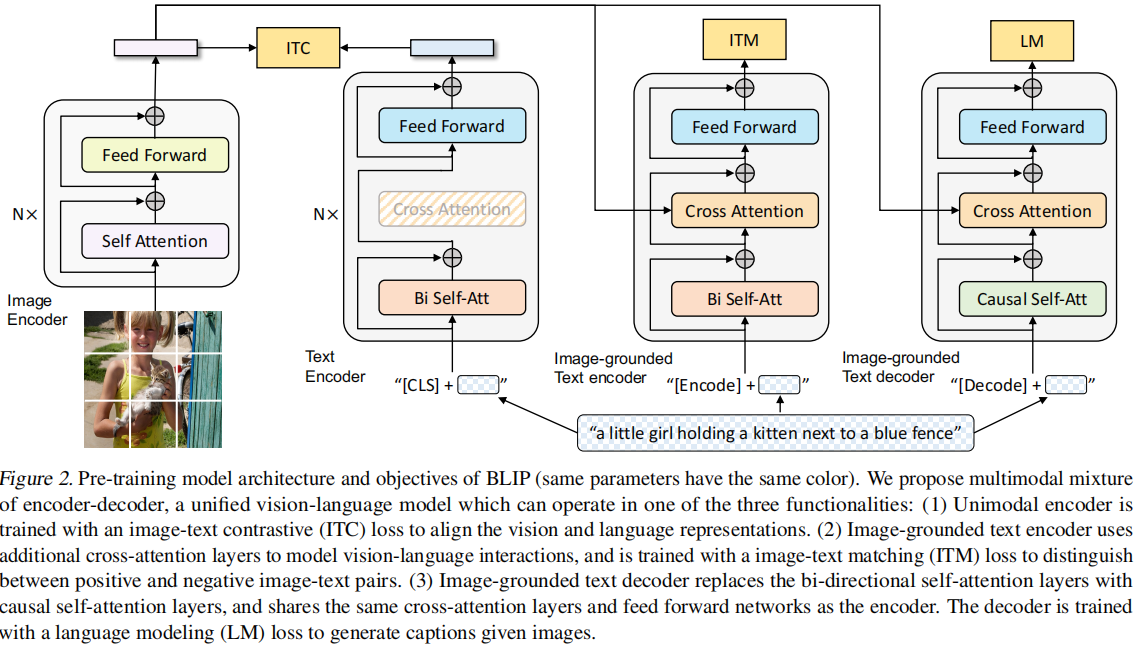 为预训练一个具有理解和生成能力的统一模型,我们提出了编码-解码器的多模态混合(MED),一种可以在三个功能之一运行的多任务模型: