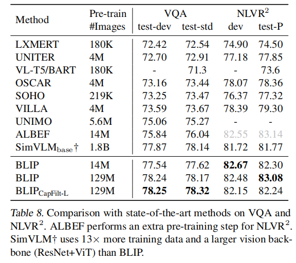 结果被显示在表8中,使用14M图像,BLIP在测试集上比ALBEF高出+1.64%,使用129M图像,BLIP比SimVLM获得更好的性能,SimVLM使用13*更多的预训练数据和更大的视觉主干有着额外的卷积阶段。
