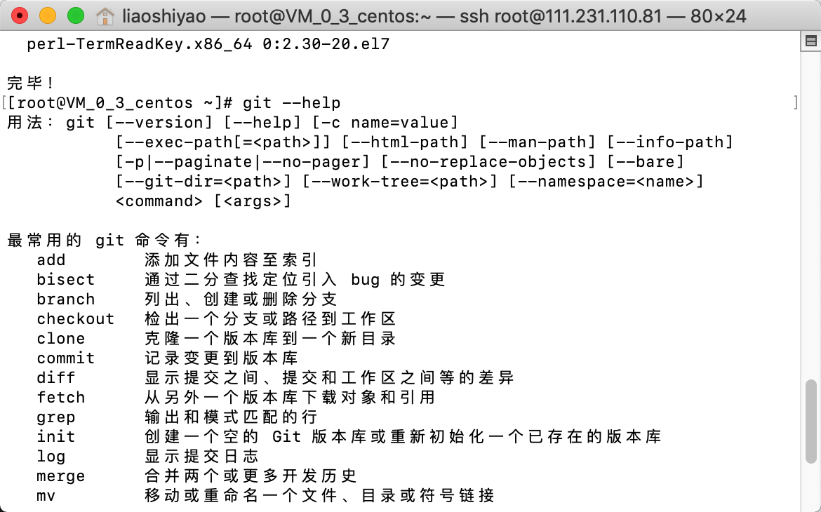Linux环境下安装Git只需要输入 “yum install git” ,安装完成后输入"git --help",如果能看到对应的提示即可。