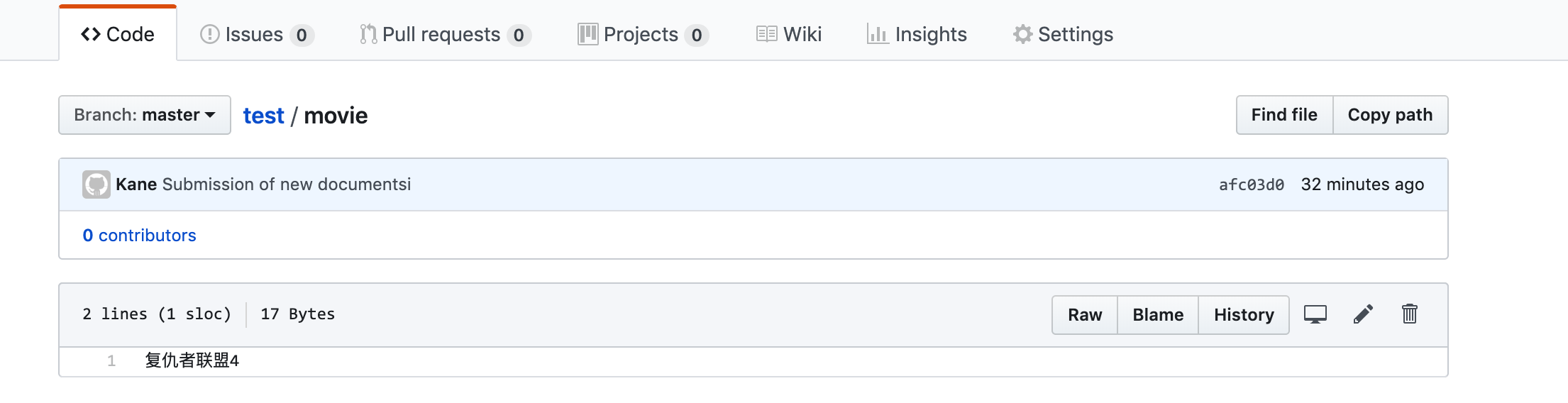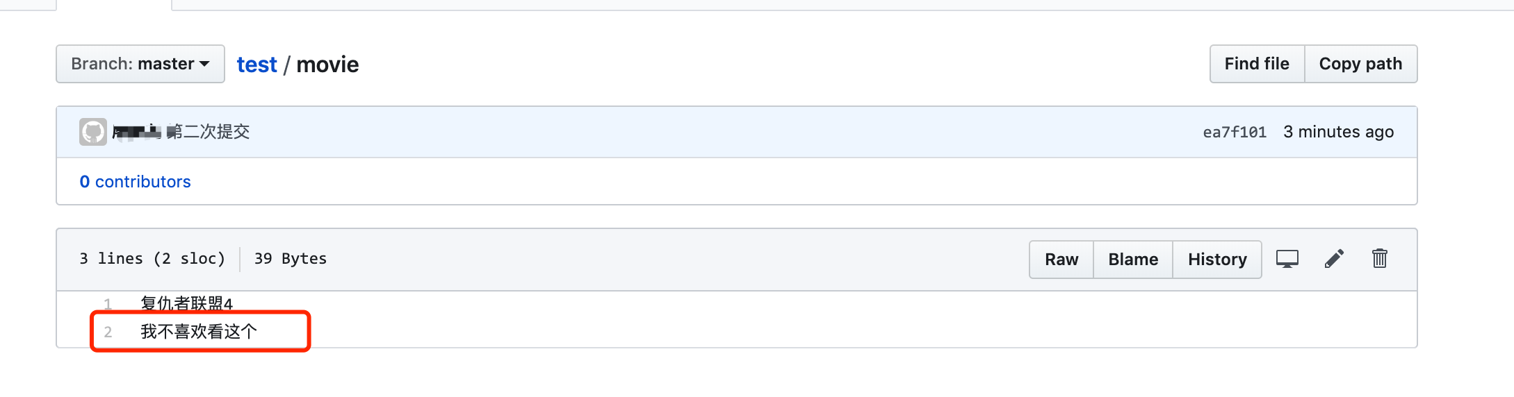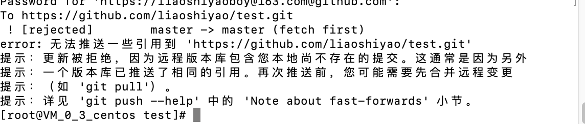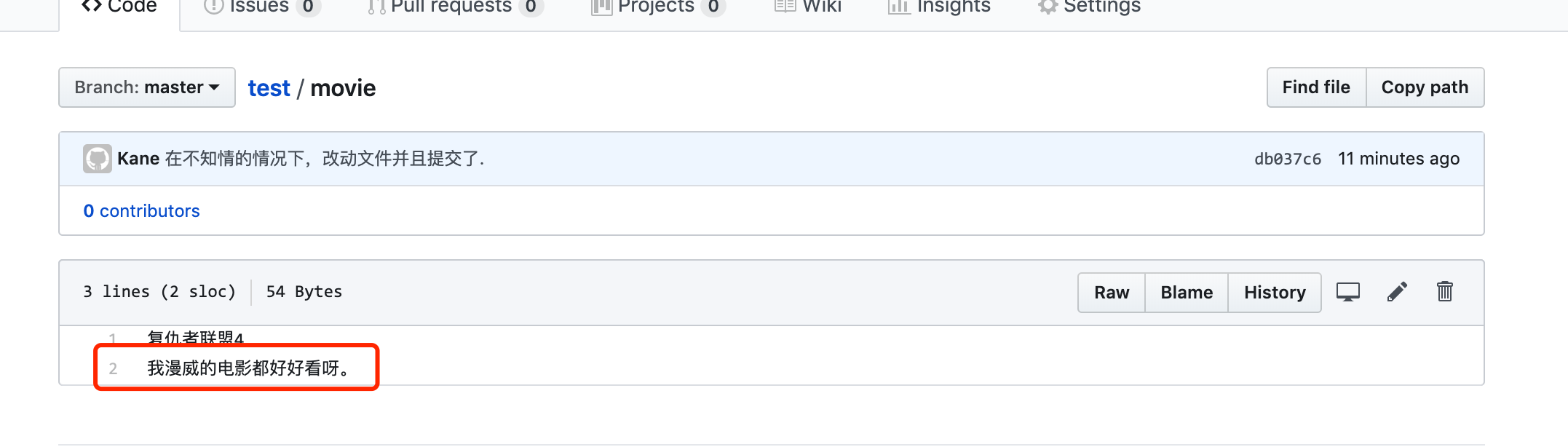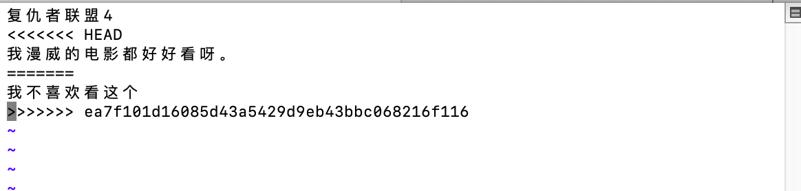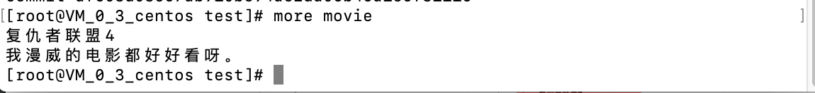 在改动之后并且推送给远程仓库,然后就直接被拒绝了。我们需要使用"git pull"先来更新远程仓库的代码,并且解决掉冲突才能提交。 在使用pull这个命令之后,在看查看movie文件内容: