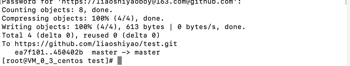 步骤六:提交到GitHub,使用 “git push” 最后提交到远程仓库中去,在提交过程中会要求输入登录的用户名和密码。最后能在GitHub中看到提交的文件即可。