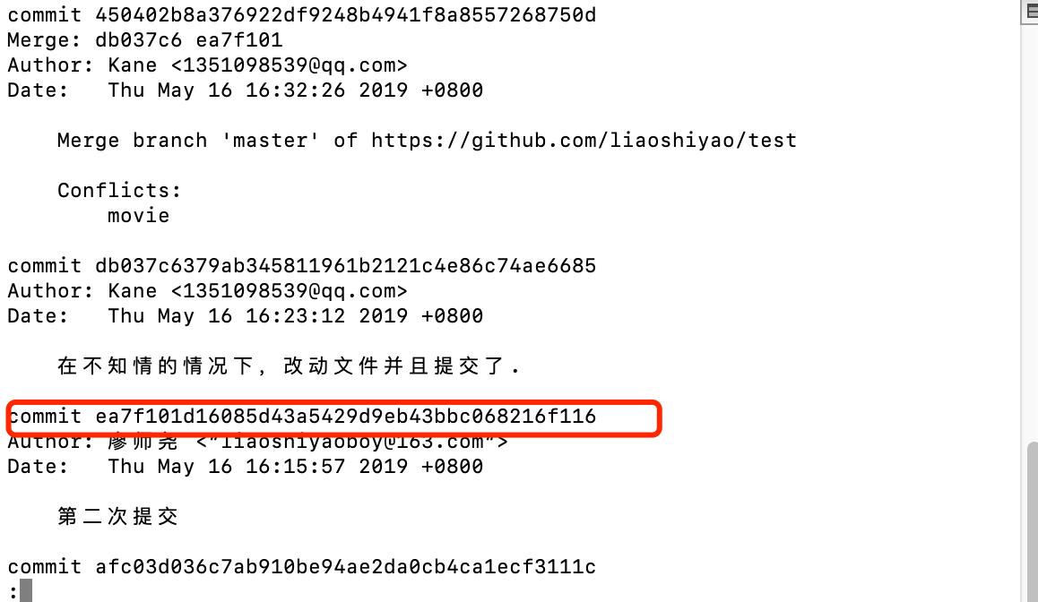 步骤二:使用"git log"命令查看提交的日志,现在我们需要会回退到之前在另外一个客户端所提交到内容。