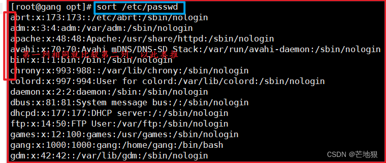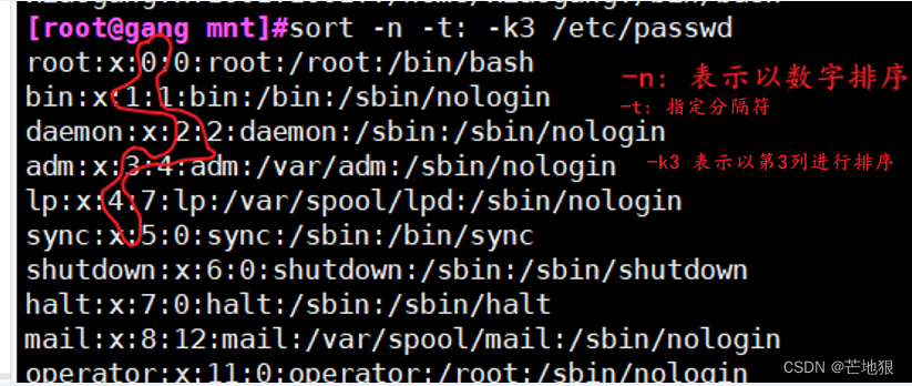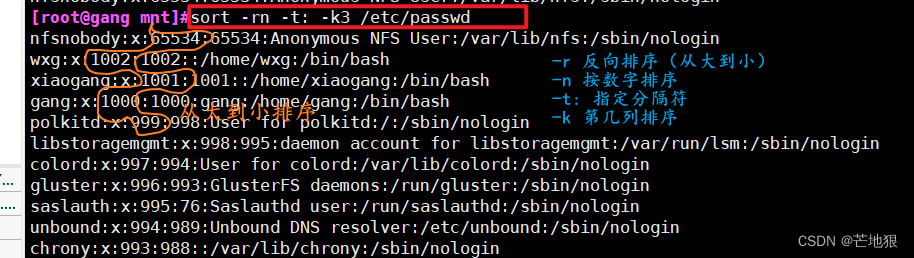 还可以选择按照哪一列进行排序,需要先定义分割符(-t),然后根据分割符去选取对应的列(-k),最后进行排序。