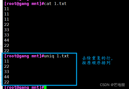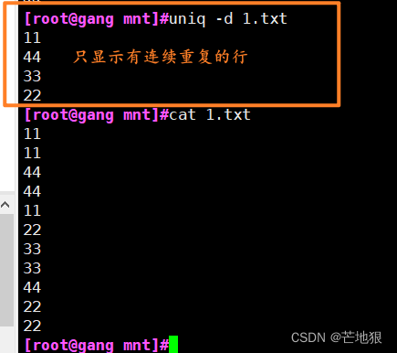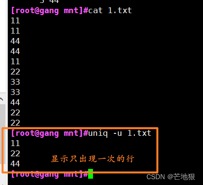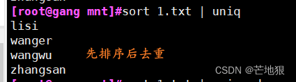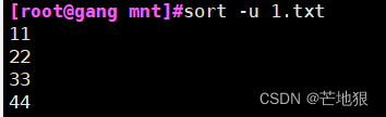 还可以将进行去重(-u),可以是不连续的行,进行去重。