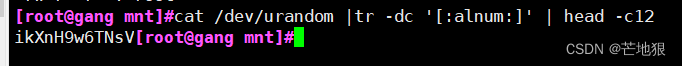 [root@gang mnt]#cat /dev/urandom |tr -dc '[:alnum:]' | head -c12