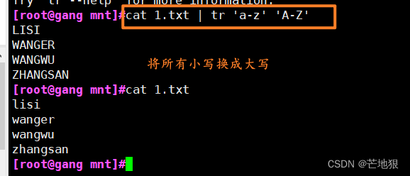 ①将所有小写换成大写 tr 'a-z' 'A-Z'