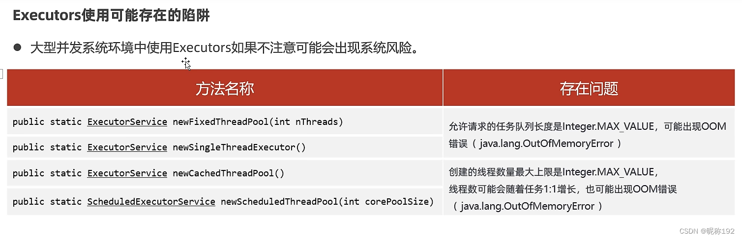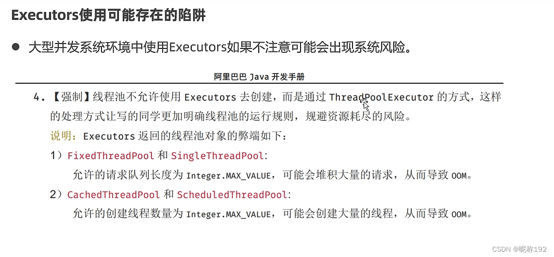 - 建议使用THreadPoolExecutor来指定线程池参数,这样可以明确线程池的运行规则,规避资源耗尽的风险