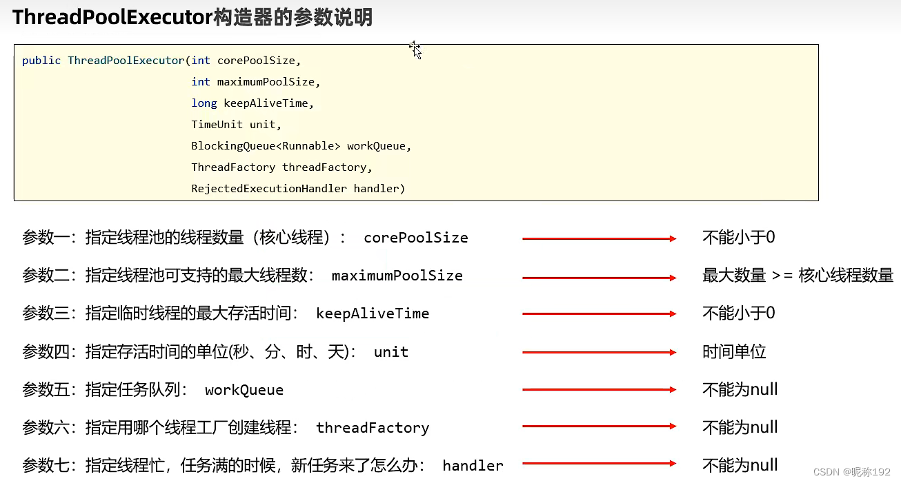 ExecutorService pool =new ThreadPoolExecutor(3(核心线程),5(最大线程数), 6(最大存活时间),TimeUnit.SECONDS(指定存活时间单位), new ArrayBlockingQueue<>(5)(指定任务队列),Executors.defaultThreadFactory()(指定线程工厂创建线程),new ThreadPoolExecutor.AbortPolicy()(新任务来了处理办法));