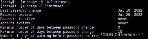 7.创建用户limituser, gid为1555,userid为1666, 让其密码在10天后过期
