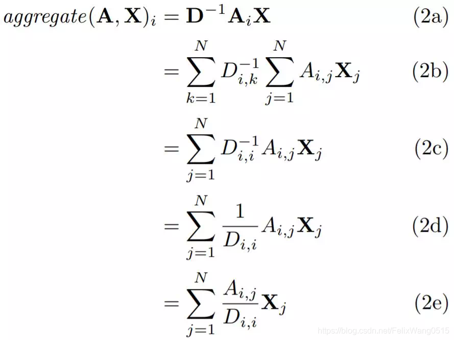 如方程2e所示,我们再次邻接矩阵中的每一行求和。在求和过程中提到的,这相当于对每个节点的邻居求和。不同的是,我们要保证2e中的加权和的权重于第i个节点的度相加等于1。因此,2e对应第i个节点的邻居特征表示的平均值。
