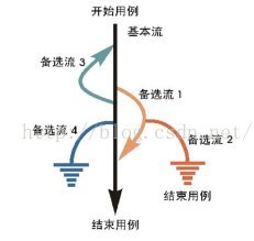 备选流:备选流从基本流开始,跳到其他界面完成用例、基本流执行时回到开始、基本流执行时打断结束,备选流执行时打断。
