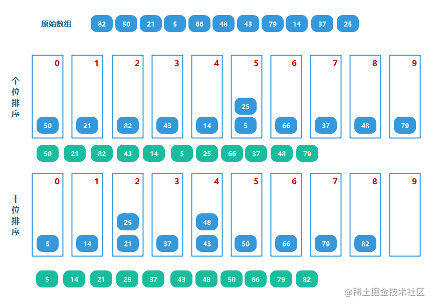 function radixSort(arr){let maxNum = arr[0];// 求出最大的数字,用于确定最大进制位arr.forEach(num => {if(num > maxNum){maxNum = num;}});// 获取最大数字有几位let maxDigitNum = 0;while(maxNum > 0){maxNum = Math.floor(maxNum / 10);maxDigitNum++;}// 对每个进制位上的数进行排序for(let i = 0; i < maxDigitNum; i++){let buckets = new Array(10).fill(0).map(() => []); // 初始化10个桶for(let k = 0; k < arr.length; k++){const bucketIndex = getDigitNum(arr[k], i); // 获取当前进制位上的数字buckets[bucketIndex].push(arr[k]); // 排序的数字放入对应桶中}// 所有数字放入桶中后,现从0-9的顺序将桶中的数字取出const res = [];buckets.forEach(store => {store.forEach(num => {res.push(num); // 注意这里,先存入桶中的数字,先取出,这样才能保持局部有序})});arr = res;}return arr;/** 求出数字每个进制位上的数字,只支持正整数@param num 整数@param digit 位数,从0开始*/function getDigitNum(num, digit){return Math.floor(num / Math.pow(10, digit) % 10)}