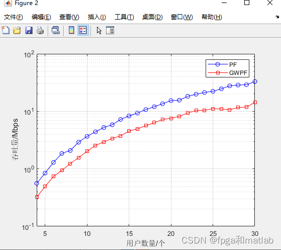 ker = 0.2;for i = 1:length(Nums)iPF_times = 100;%m为调度次数G = Nums(i);%为UE个数CC = 3; %个数T = Twind;Rbs = zeros(G,CC,PF_times); %矩阵s为每次调度RB所分配的UERates = zeros(G,G); %整个调度过程每个UE所获得的速率Avg_rate = ones(1,G,PF_times+1); %每个UE所获得的平均速率Rand_rate= [];Sum_rate = [];%不同载波频率衰减不一样PL1 = 58.83+37.6*log(10*dist/1e3) + 21*log(10*f1);PL2 = 58.83+37.6*log(10*dist/1e3) + 21*log(10*f2);PL3 = 58.83+37.6*log(10*dist/1e3) + 21*log(10*f3);for n=1:PF_times; %调度次数rng(n);%初始化alphaalpha = zeros(1,G);%侵略因子%生成随机速率信息Rand_rate(:,:,n) = randint(G,CC,[0 500]); %pf调度%每个RB开始分配for jq = 1:CC; t = 1;if jq == 1;PL=PL1;end;if jq == 2;PL=PL2;end;if jq == 3;PL=PL3;end;for jG = 2:G; if Rand_rate(jG,jq,n)/Avg_rate(1,jG,n)>Rand_rate(t,jq,n)/Avg_rate(1,t,n) & PL>=300+50*rand;t = jG;endendRbs(t,jq,n) = G*rand;end %获得的速率Sum_rate(:,:,n) = Rbs(:,:,n)*Rand_rate(:,:,n)'; %整个调度过程每个UE所获得的速率Rates(:,:) = Sum_rate(:,:,n)+Rates(:,:); %更新平均速率for k2=1:G; Avg_rate(1,k2,n+1)=(1-1/T).*Avg_rate(1,k2,n)+(1/T).*Sum_rate(k2,k2,n);endendspeed(i) = sum(sum(Rates))/1e6;speed1(i) = ker*speed(i);speed2(i) = speed(i)-ker*speed(i);