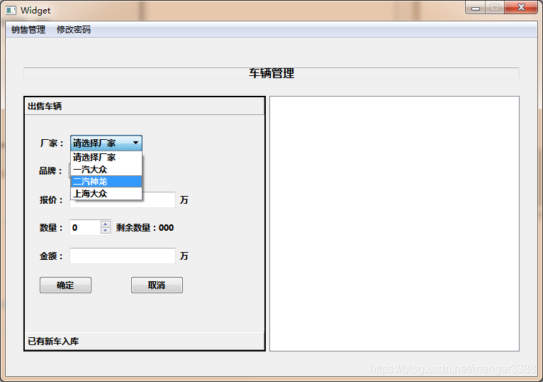 项目实现了车辆与销售的的管理,运行程序出现登录界面,输入正确的密码才能登录,进入主界面后有两个菜单,【销售管理】和【修改密码】,【销售管理】菜单下有三个子菜单,【车辆管理】、【销售统计】、【退出】。其中车辆信息使用数据库进行存储,销售记录使用XML文档存储。