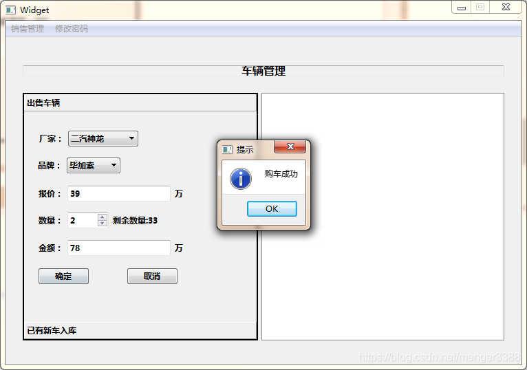 //获取页面上的厂家和型号QString factory = ui->sellFactoryComboBox->currentText();QString name = ui->sellBrandComboBox->currentText();//获取数量并计算购买后的剩余数量int value = ui->sellNumSpinBox->value();int last = ui->sellNumSpinBox->maximum()-value;//查询该型号的销售量QSqlQuery query;query.exec(QString::fromLocal8Bit("select sell from brand where name='%1' and factory='%2'").arg(name).arg(factory));query.next();//销售量加上购买数量就是最新的销售量int sell = query.value(0).toInt()+value;//连接数据库,并更新销售量和剩余数量QSqlDatabase::database().transaction();bool rtn = query.exec(QString::fromLocal8Bit("update brand set sell=%1,last=%2 where name='%3'and factory='%4'").arg(sell).arg(last).arg(name).arg(factory));//判断是否更新数据成功if(rtn){//成功则弹出提示信息QSqlDatabase::database().commit();QMessageBox::information(this,tr("Tip"),tr("Successful car purchase"),QMessageBox::Ok);//并将页面恢复到初始状态on_sellCancelBtn_clicked();}else {//如果失败则进行数据回滚,在sql语句执行失败时,使用了此语句,可以将数据回滚到sql语句执行前的状态。QSqlDatabase::database().rollback();}