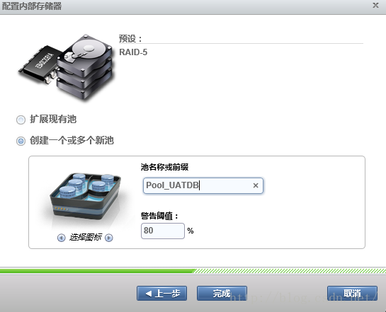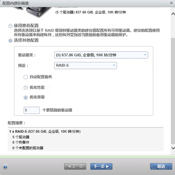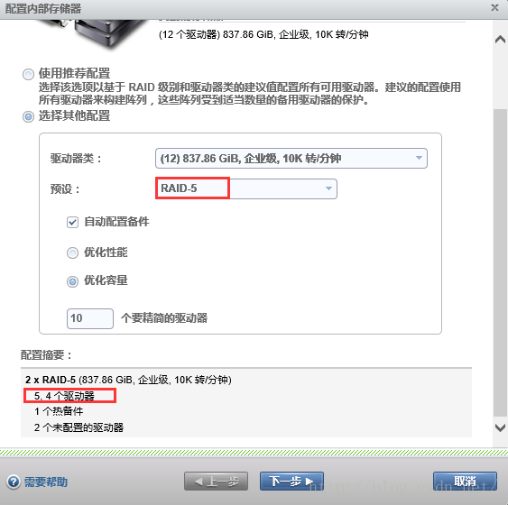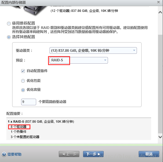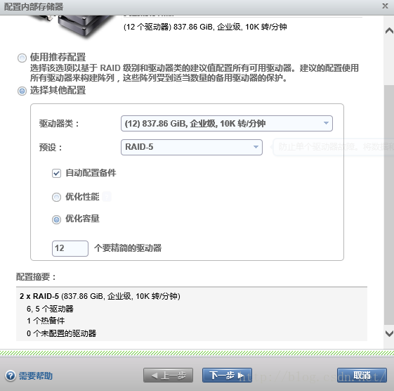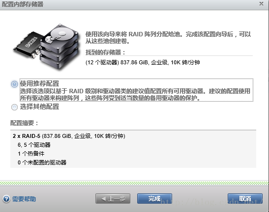 对内部存储进行RAID阵列配置,可以使用系统推荐自动配置,也可以根据需要手动配置。