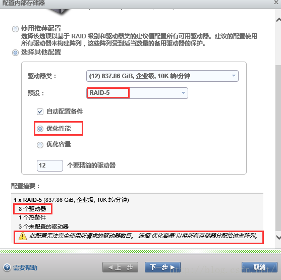 可以看到,为了达到较好的性格,RAID5最多允许一组有8块盘,如果设置了9块,则会被拆分成2个RAID5组