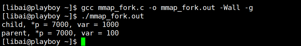 {int *p;int fd;pid_t pid;fd = open("temp", O_RDWR | O_CREAT | O_TRUNC, 0644);if (fd < 0){perror("open error\n");exit(1);}ftruncate(fd, 4);p = (int*)mmap(NULL, 4, PROT_READ | PROT_WRITE, MAP_SHARED, fd, 0);if (p == MAP_FAILED){perror("mmap error\n");exit(1);}close(fd);pid = fork();if (pid == 0){*p = 7000; // 对映射区空间进行写操作var = 1000;printf("child, *p = %d, var = %d\n", *p, var);}else if(pid >0){sleep(1);printf("parent, *p = %d, var = %d\n", *p, var);wait(NULL);int ret = munmap(p,4);if (ret == -1){perror("munmap error\n");exit(1);}}return 0;