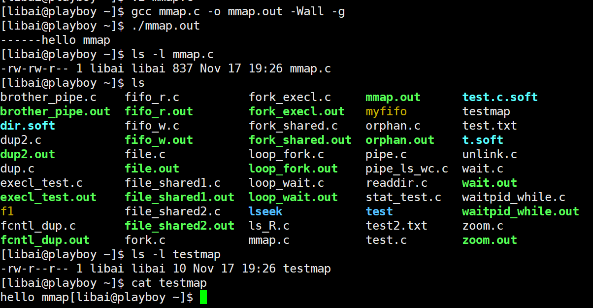 {int fd, ret;char* p = NULL;fd = open("testmap", O_RDWR | O_CREAT | O_TRUNC, 0644);if (fd < 0){sys_error("open error\n");}/*lseek(fd, 10 , SEEK_END); // 与 ftruncate 等效write(fd, "\0", 1);*/ftruncate(fd, 10); // 需要写权限才能拓展文件大小int len = lseek(fd, 0, SEEK_END);p = mmap(NULL, len, PROT_READ | PROT_WRITE, MAP_SHARED, fd, 0);if (p == MAP_FAILED) // 返回值一定要检查{sys_error("mmap error\n");}strcpy(p, "hello mmap");printf("------%s\n, p");ret = munmap(p, len);if (ret == -1)sys_error("munmap error\n");close(fd);return 0;}