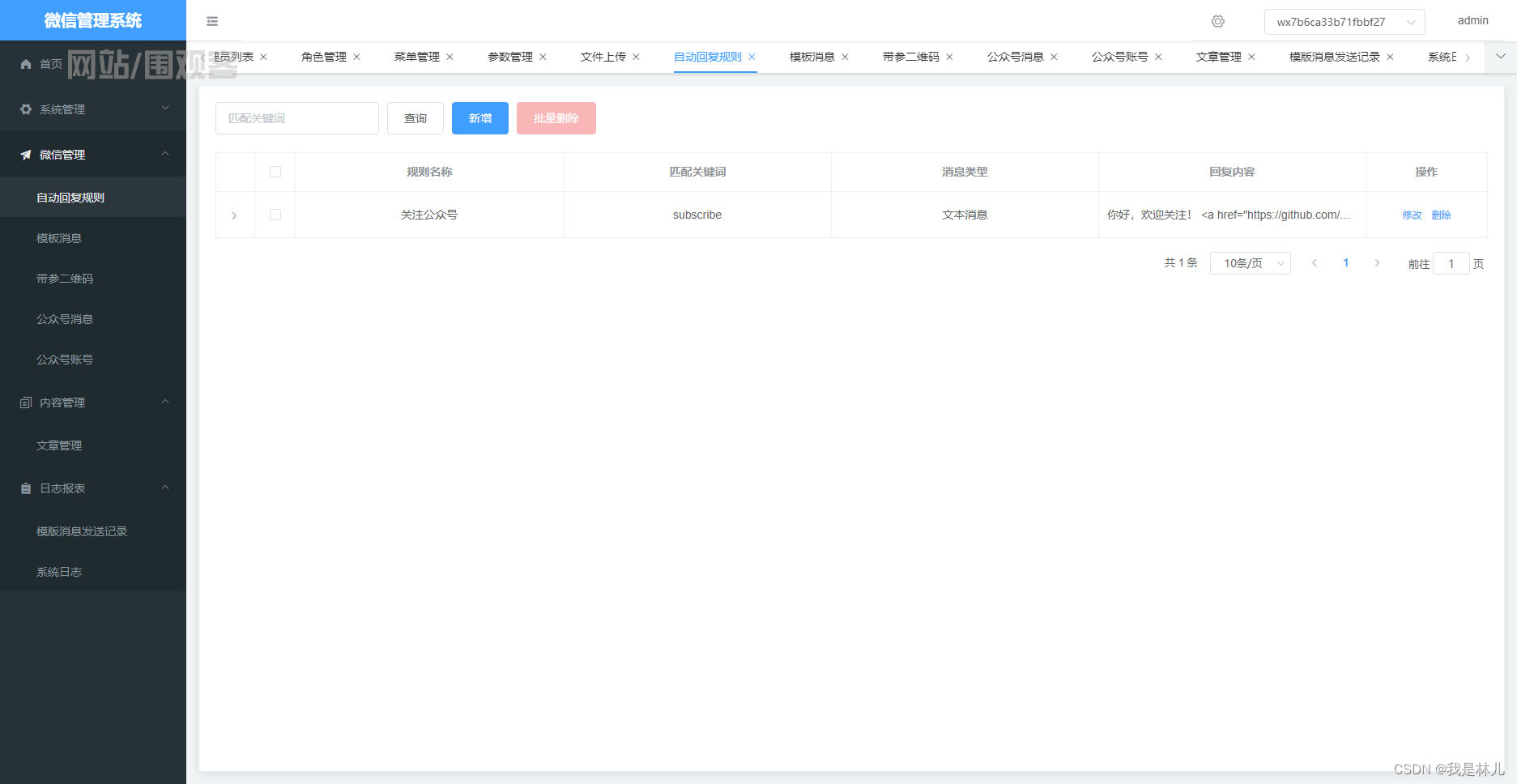 自动回复规则(规则名称,匹配关键词,消息类型,回复内容,操作.)