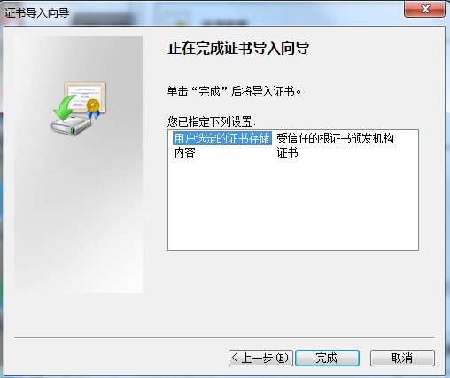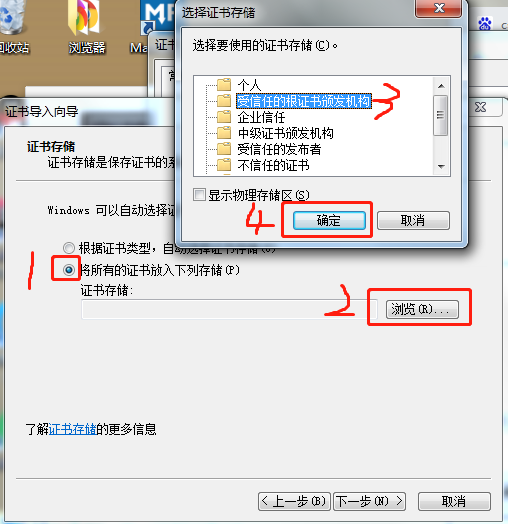 点击“安装证书”,在点击“下一步”,设置如下,后面再点击下一步,最后点击确定。