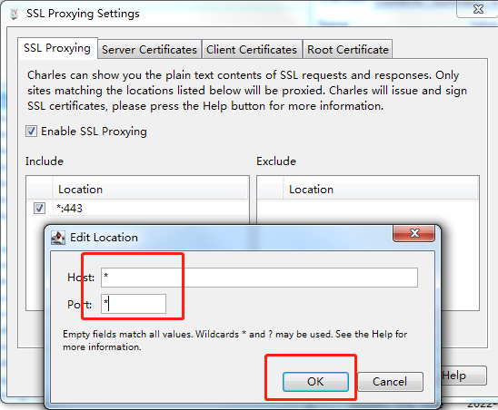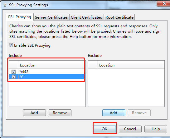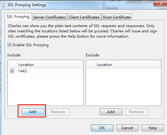 解决方法:菜单栏中选择“Proxy”——>"SSL proxying settings"——>"Add"——>全部填*——>再点击OK,记得勾选“Enable SSL Proxying”前面的方法,填上 *:443 和 *:*