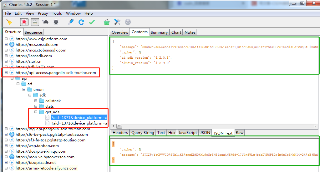 完成了以上步骤就可以抓到https请求的数据了,如抓到穿山甲广告的请求和响应的数据,效果图如下(穿山甲想要的抓包数据就是两个绿色方框内容):