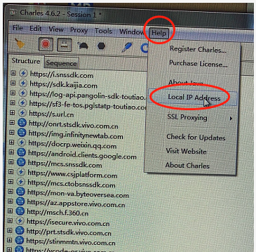 法1:在Charles菜单栏选择“Help”->“Local IP Address”,就会出现Charles所在电脑的ip。如下图: