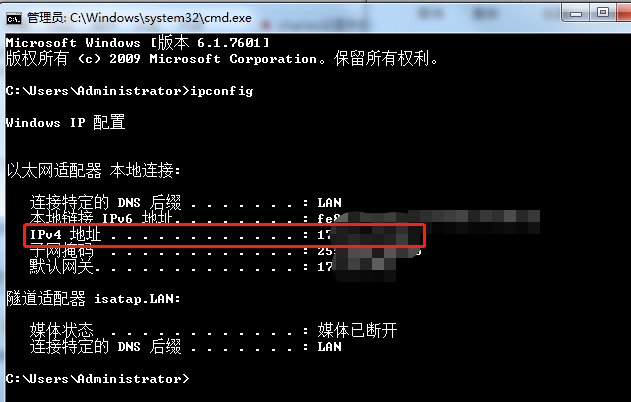 法2:获取IP地址也可以在cmd中输入ipconfig。IPv4