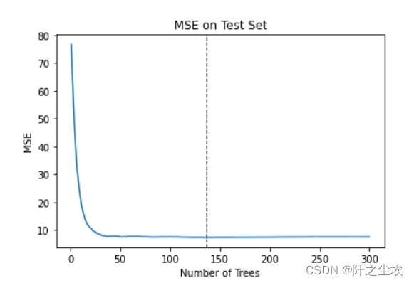 for n_estimators in range(1, 301):model = GradientBoostingRegressor(n_estimators=n_estimators, subsample=0.5, max_depth=5, learning_rate=0.1, random_state=123)model.fit(X_train, y_train)pred = model.predict(X_test)mse = mean_squared_error(y_test, pred)scores.append(mse)index = np.argmin(scores)