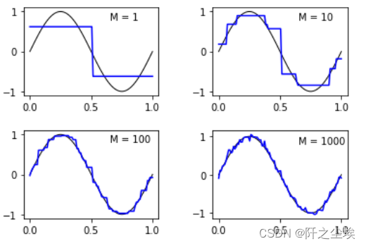 for i, m in zip([1, 2, 3, 4], [1, 10, 100, 1000]):model = GradientBoostingRegressor(n_estimators=m, max_depth=1, learning_rate=1, random_state=123)model.fit(x.reshape(-1, 1), y)pred = model.predict(w.reshape(-1, 1))plt.subplot(2, 2, i)plt.plot(w, np.sin(2 * np.pi * w), 'k', linewidth=1)plt.plot(w, pred, 'b')plt.text(0.65, 0.8, f'M = {m}')