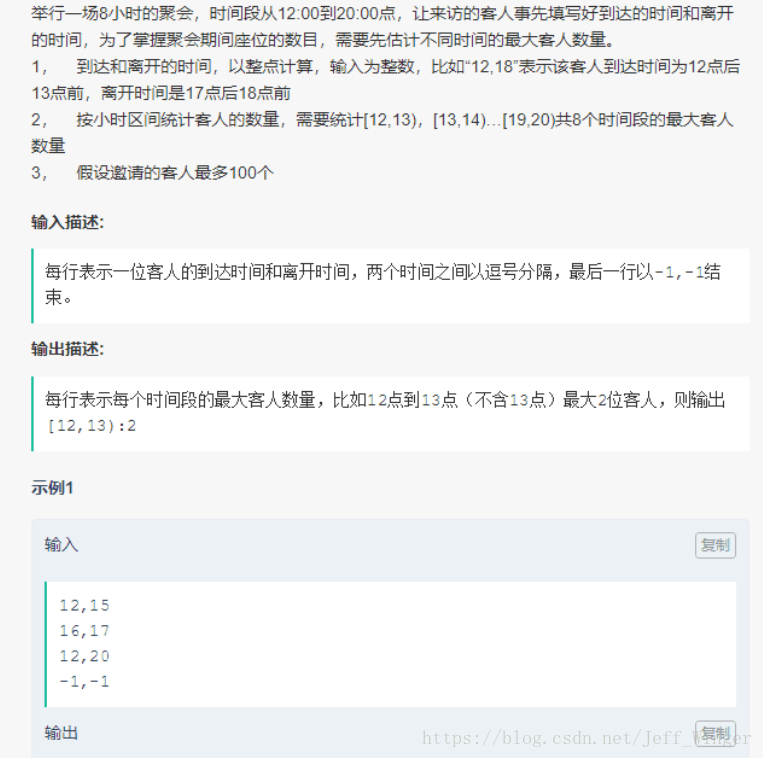 {vector<pair<int,int>> time{{12,13},{13,14},{14,15},{15,16},{16,17},{17,18},{18,19},{19,20}};vector<pair<int,int>> people;map<pair<int,int>,int> result;int a,b;while(true){cin>>a;if(cin.get()==','){cin>>b;if(a==-1&&b==-1){break;}people.push_back(make_pair(a,b));}}for(pair<int,int> pa:people){for(pair<int,int> t:time){if(pa.first<=t.first&&pa.second>=t.second){++result[t];}}}for(pair<pair<int,int>,int> re:result){cout<<'['<<re.first.first<<','<<re.first.second<<')'<<':'<<re.second<<endl;}return 0;