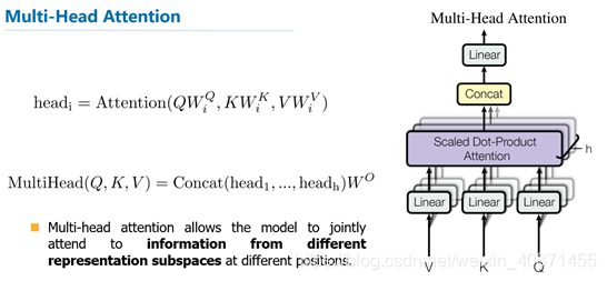这里的W是三个不同的待训练的权值参数矩阵,由于有h个头,所以有h个维度,每个维度又是一个向量,