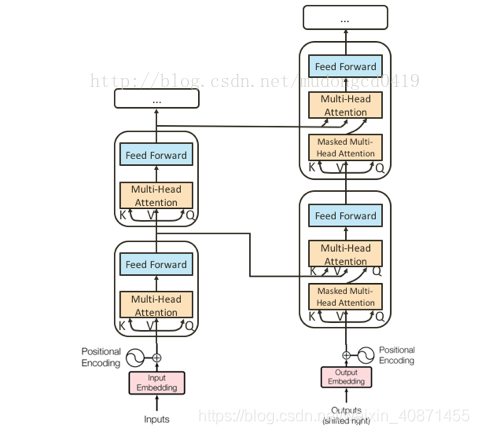 再次回看图一,我们发现Decoder也是由N层组成,将视野切换回单层的decoder中,我们发现decoder多了一个multi-head attention,该层的输入的Q为self-attention的输出,K和V来自Encoder(对应层)的输出,特别注意是对应层,什么意思呢,encoder的第一层的输出作为decoder第一层的输出,将图一立起来,从上往下,他们的堆叠关系如下图: