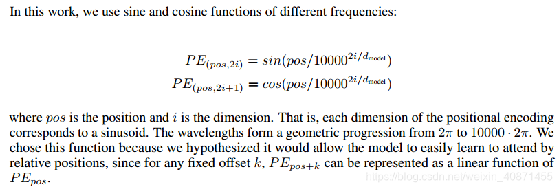 这里使用了两个函数, sin, cos, pos 用来表示单词的位置信息, 比如 第一个单词, 第二个单词什么的。 而 i 用来表达dimension。 论文中, d_{model} 是512, 那 i 应该是 0 到255. 这里呢, 为了好说明, 如果2i= d_{model}, PE 的函数就是sin(pos/10000), 那它的波长就是10000*2pi, 如果i =0, 那么他的波长 就是2pi. 这样的sin, cosin 的函数 是可以通过线性关系互相表达的。