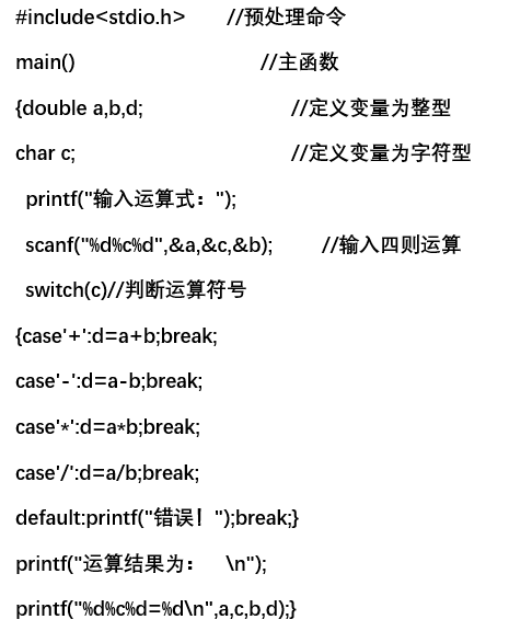 简单计算器程序 编写一个简单计算器程序,输入格式为:data1 op data2。其中data1和data2是参加运算的两个数,op为运算符,它的取值只能是、-、*、/。。要求必须使用switch-case语句实现。