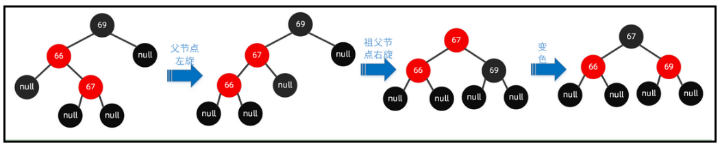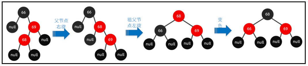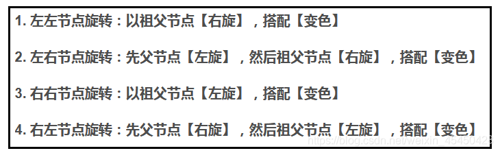2. 左右节点旋转:先父节点【左旋】,然后祖父节点【右旋】,搭配【变色】