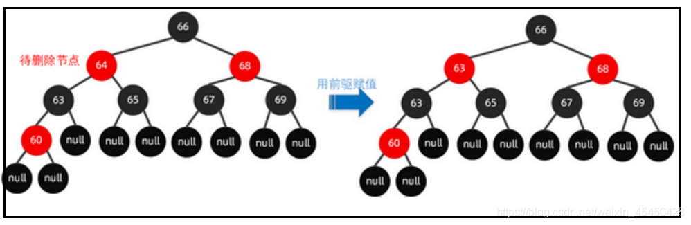 第一步:用前驱对待删除的节点进行赋值(用后驱节点也可以,这里以前驱节点为例)(待删除节点是64)