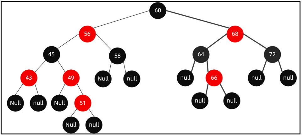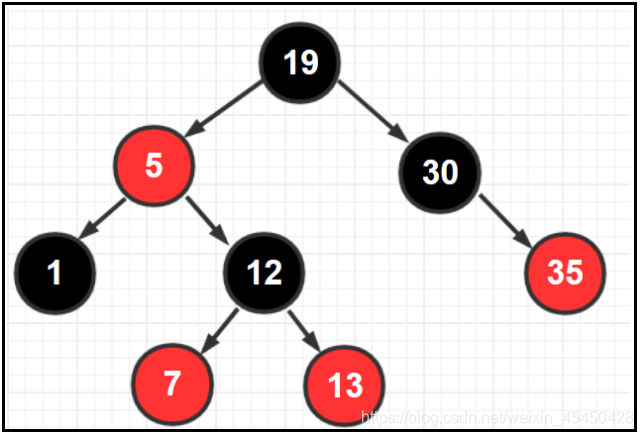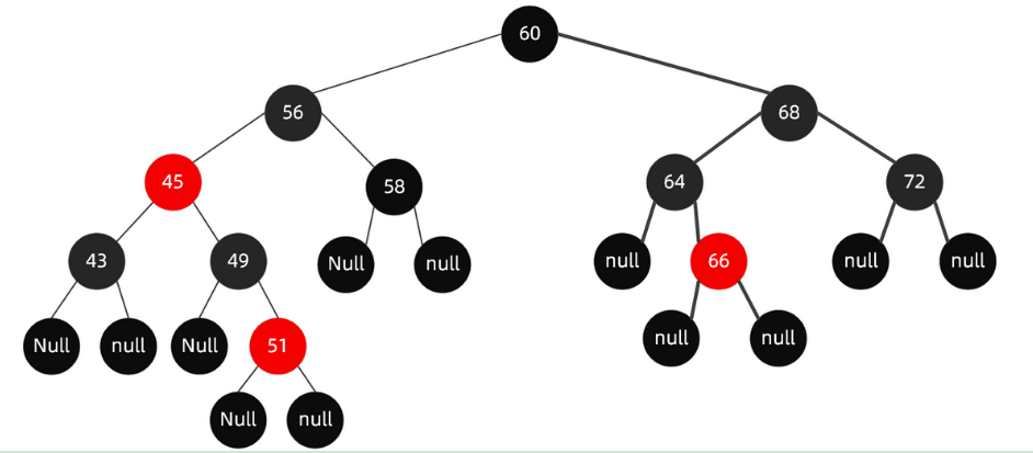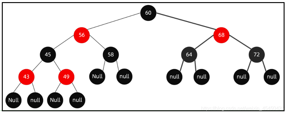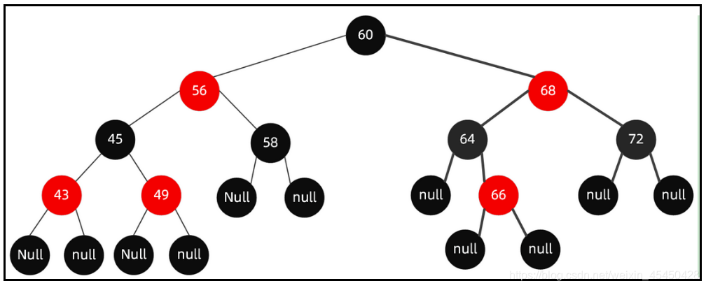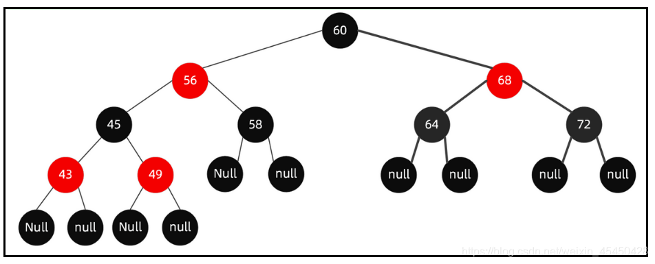 4. 红色节点不能相连 意思就是每个红色节点的两个子节点都是黑色,且可能出现连续黑色节点