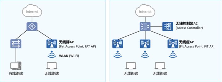 - 无线瘦AP(FIT AP):适用于大中型企业,无法独立运营,需要配合无线控制器(AC-Access Controller)使用,当FIT AP在AC上线时,AC即可对FIT AP进行调控,AC统一管理和配置,功能丰富。