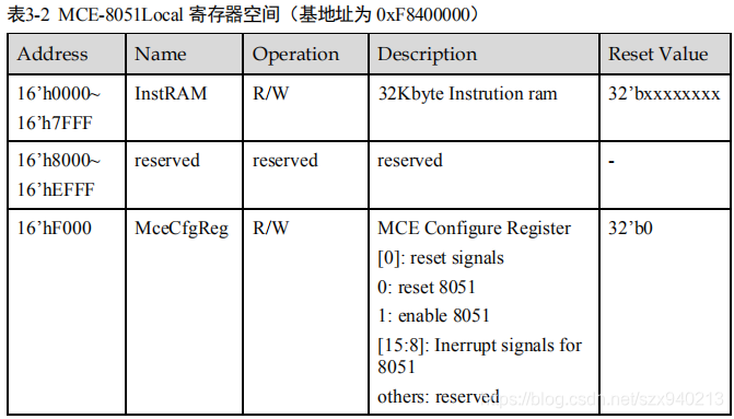 MCE-8051Local 寄存器空间为 64KB,ARM CPU 可以通过该寄存器空间访问 MCE-8051 内部指令 RAM 和查询中断状态等。