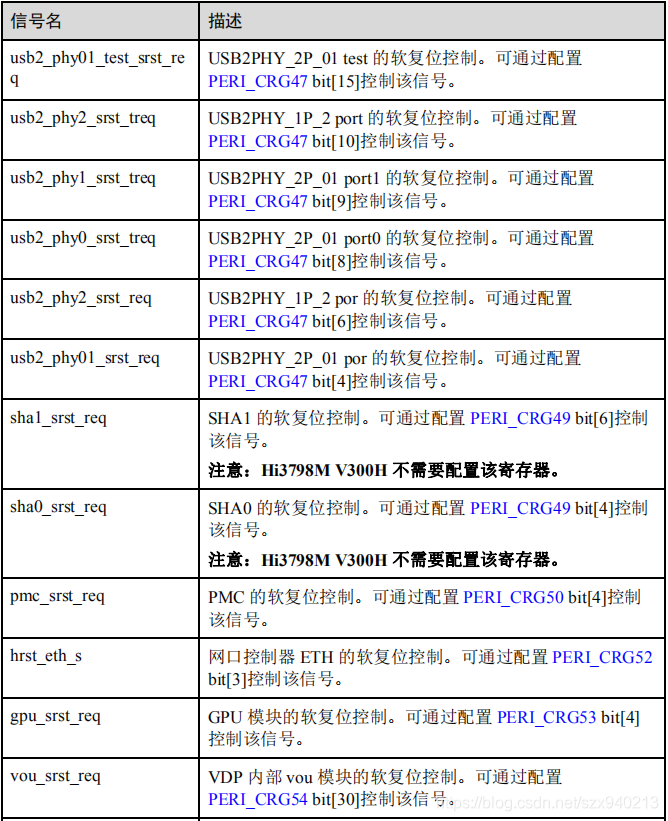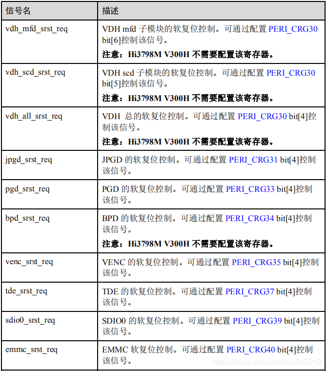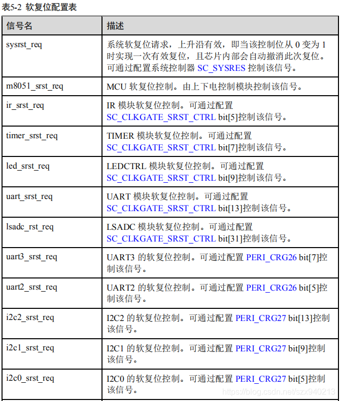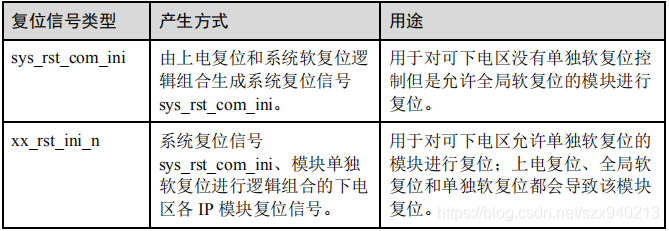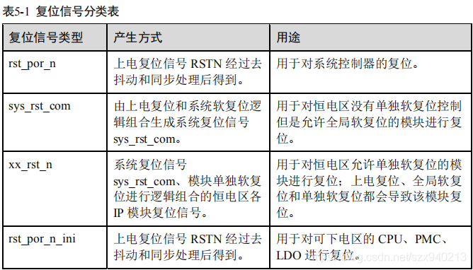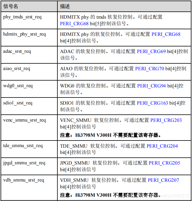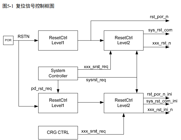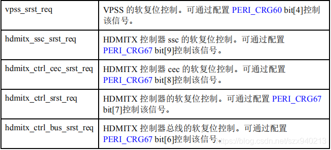 xxx_srst_req:各模块单独软复位请求信号,源自系统控制器或 CRG 控制器。例如:tde_srst_req。